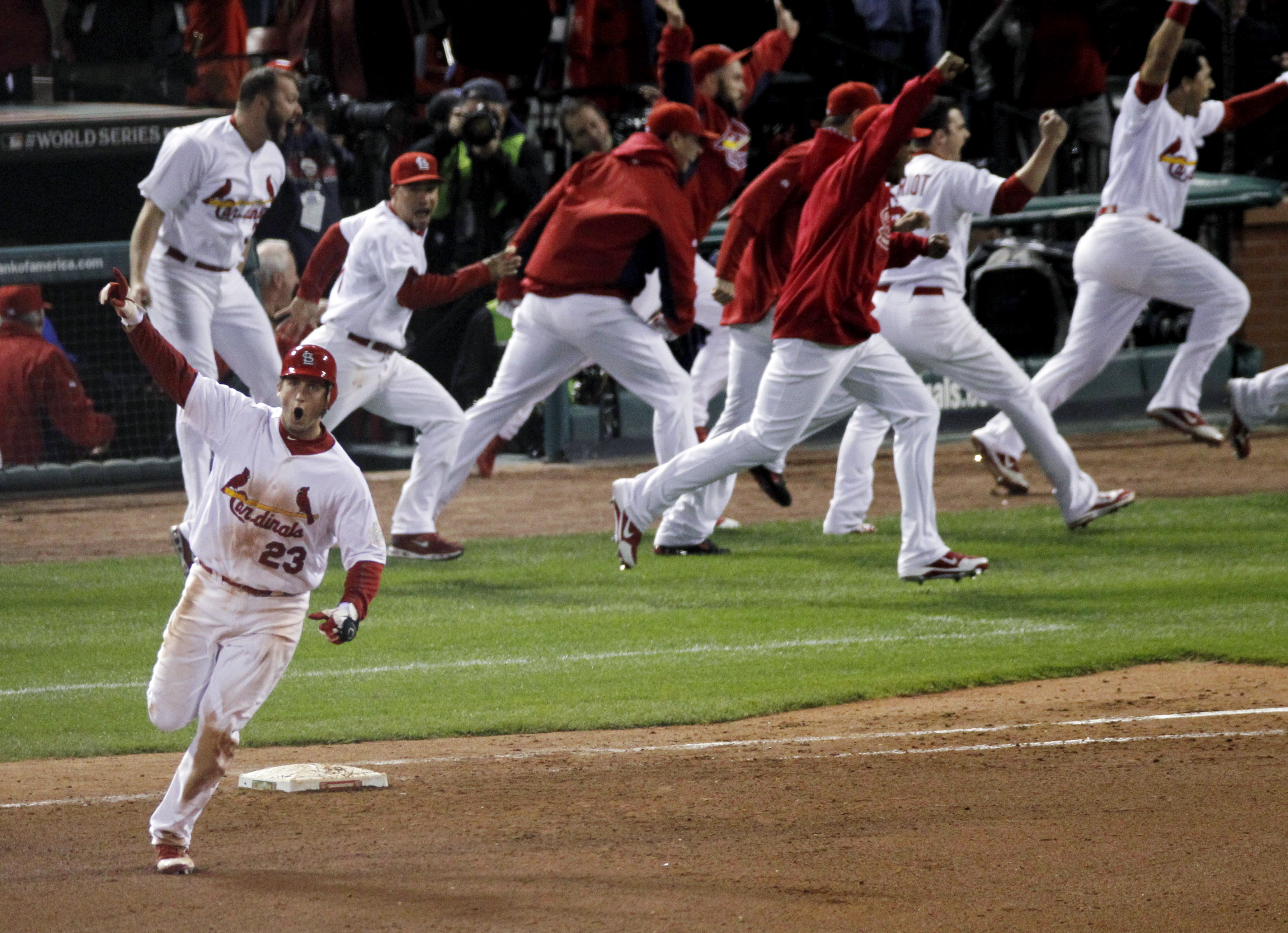 In what turned out to be the best game of arguably the greatest World Series ever played, the score went back and forth all night, with Texas just one win away from their first title in franchise history. Funny thing about the Postseason: it’s where legacies are made, and the story in 2011 was St. Louis third baseman David Freese. On a team that included Lance Berkman, Matt Holliday and Albert Pujols, David Freese was far from the biggest bat in the lineup. But this where a local legend was born. Trailing 7-5 in the bottom of the 9th inning and down to their last out, Freese stepped up to the plate with two runners on and hit a line drive over the head of right fielder Nelson Cruz that ricocheted off the wall and driving in two with Freese sliding headfirst into 3rd for a game-tying triple. The inning would end there and go to extra innings.