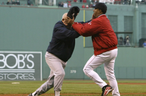 Retaliation came in the bottom of the 4th when Manny Ramirez came to the plate against Clemens. Clemens threw a 1-2 pitch high, and Manny ducked out of the way. Now, this pitch was definitely high and out of the zone, but it wasn’t anywhere close to hitting Manny, but Ramirez and the Red Sox were looking for a reason to fight. Manny charged towards Clemens before the umpires and Posada stepped in. The benches cleared and the 72-year-old Don Zimmer made a beeline for Martinez. On the broadcast, you can see Pedro talking to the oncoming Zimmer, before throwing Zimmer to the ground. You could see that Zimmer approached Pedro with his hands raised, intending to hit him. Instinctively, Pedro grabbed Zimmer on both sides of his head and tossed him aside.